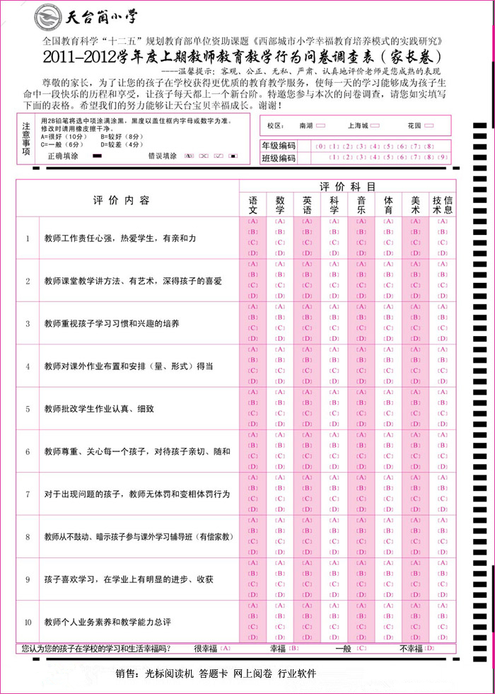 本公司采用的雙發(fā)一收光柵式光電傳感器,并采用DSP處理器,CPLD和高頻數(shù)字電路抗干擾技術(shù),實(shí)現(xiàn)了高速采樣控制和智能模糊識(shí)別算法,大大改善了涂點(diǎn)識(shí)別的準(zhǔn)確性和智能化程度,徹底解決了以往閱讀機(jī)因電路造成的漏、冒點(diǎn)問(wèn)題。對(duì)于不太規(guī)范的,橡皮擦不干凈的涂點(diǎn)都有令人滿意的智能識(shí)別效果并增加了系統(tǒng)的穩(wěn)定性。